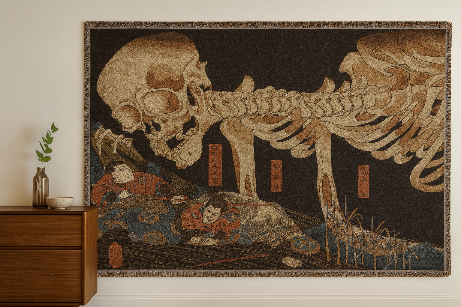 A limited launch of Ukiyo-e artistry with tattoo culture. An ancient Japanese myth reimagined in woven form. Crafted on jacquard looms with over 100,000 threads, each piece captures the depth of ink through texture and shadow.